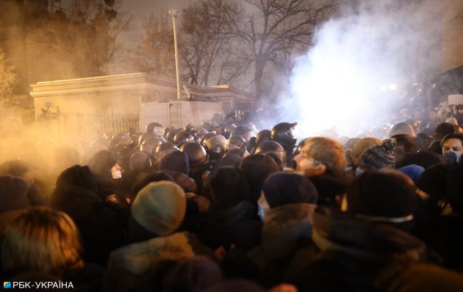 Учасники акції намагалися прорватися до Офісу президента. З бійців зривали шоломи, перед їх обличчями запалювали фаєри і тримали, щоб засліпити поліцейських, які стояли в передніх рядах. Деякі розпилювали в бік правоохоронців сльозогінний газ з балончиків.