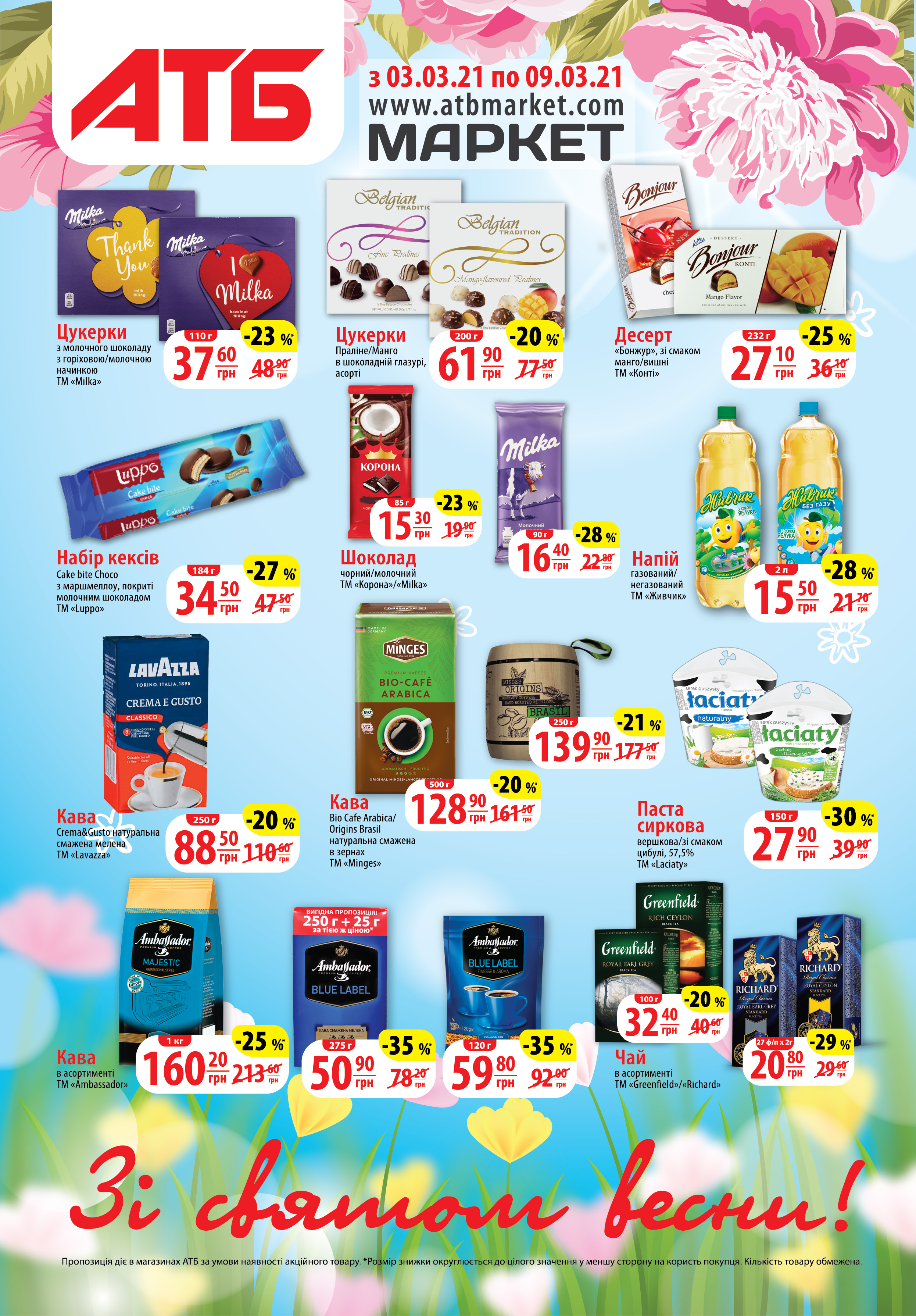 І, звичайно ж, в АТБ можна вибрати хороший подарунок на 8 березня. Зокрема, знижки діють на цукерки, подарункові набори, пімнатні рослини. Більш детально можна ознайомитися на фото.