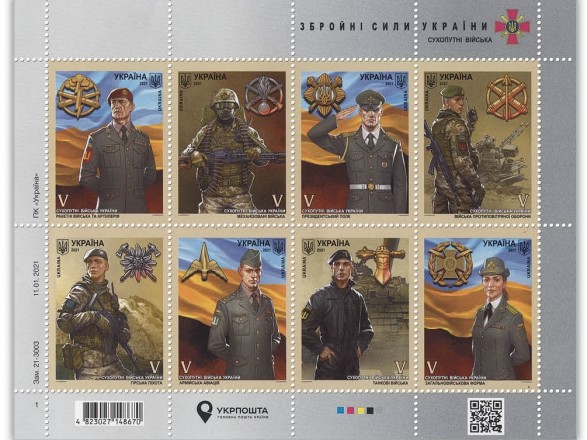 "Марковий аркуш складається з 8 поштових марок. На марках представлені форми ракетних військ та артилерії, механізованих військ, військ протиповітряної оборони, гірської піхоти, танкових військ, армійської авіації, президентського полку та загальновійськова форма", - повідомили в Укрпошті.