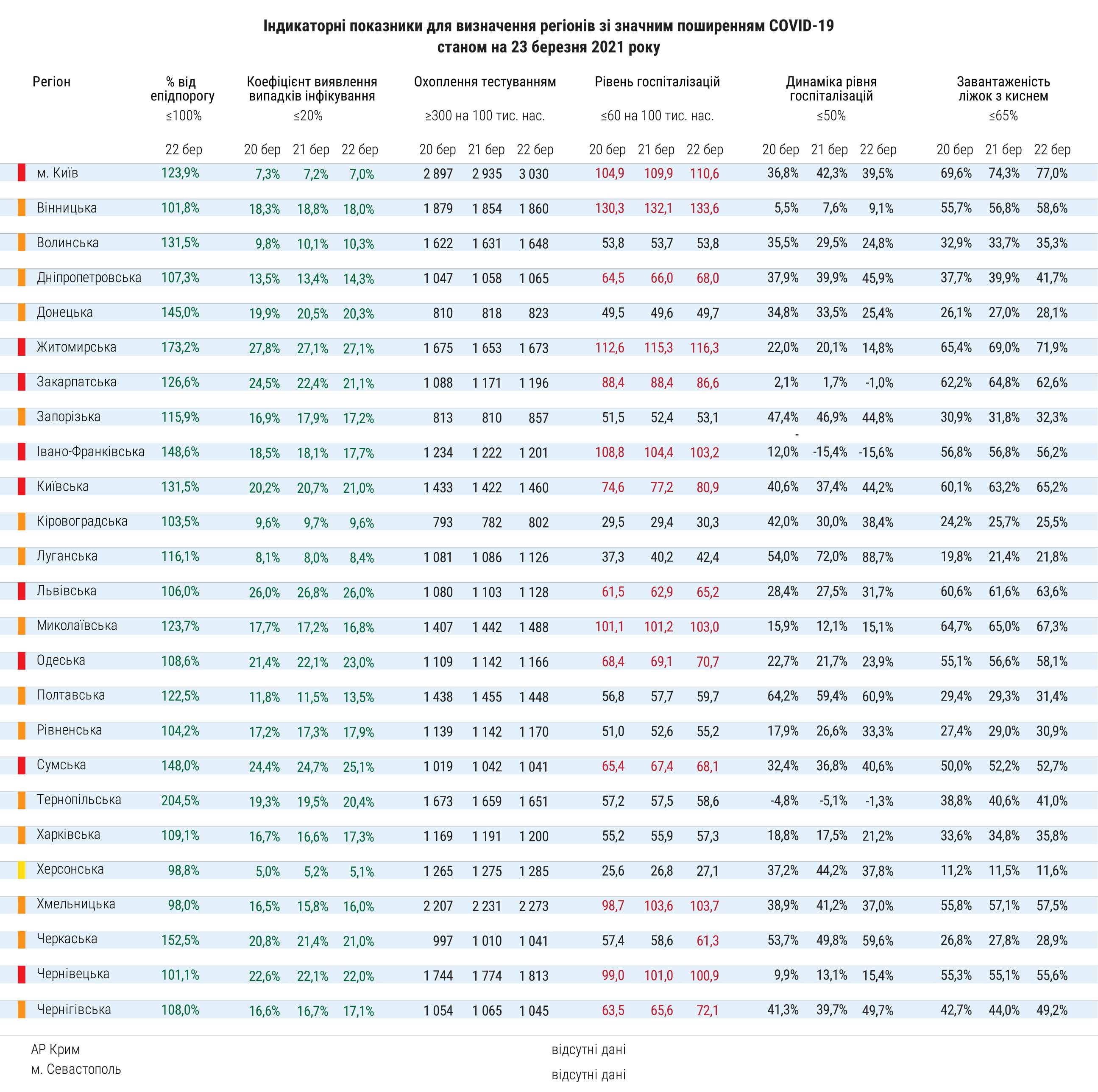Міністерство охорони здоров'я повідомляє, що станом на 23 березня "червоному" рівню відповідають 9 регіонів: сьогодні до цього списку додалася Львівщина.