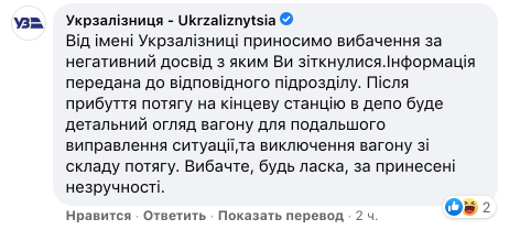 У коментарях до посту представники "Укрзалізниці" відреагували вибаченнями за незручності і зазначили, що вагон буде оглянутий для подальшого виправлення ситуації після прибуття на кінцеву станцію.