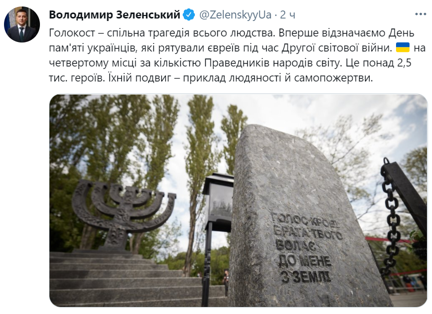 "Голокост – спільна трагедія всього людства. Вперше відзначаємо День пам'яті українців, які рятували євреїв під час Другої світової війни. Україна на четвертому місці за кількістю Праведників народів світу. Це понад 2,5 тис. героїв. Їхній подвиг – приклад людяності й самопожертви", - зазначив голова держави.