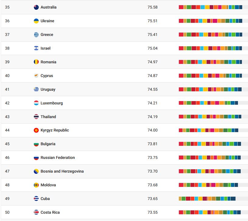 За даними звіту, Україна обійшла в рейтингу Грецію (37 місце), Ізраїль (38), Люксембург (42), а також Росію (46).
