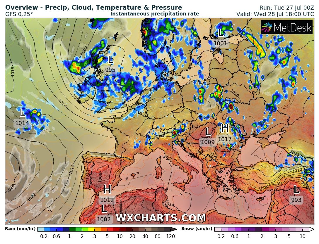 За її словами, північні циклони Elior та Dirk 28-го липня спричинять дощі з грозами на значній частині Європи, окрім півдня континенту.