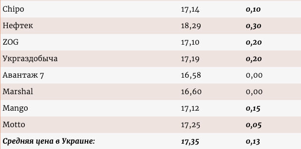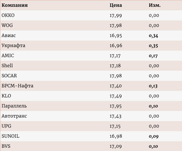 Ціна на АЗС мережі "Приват" зросла в середньому на 34-35 копійки за літр, до 16,95-16,96 грн/л. AMIC підняв ціну на 17 копійок за літр, до 17,17 грн/л. ZOG та "Укргазвидобування" - на 20 копійок за літр.