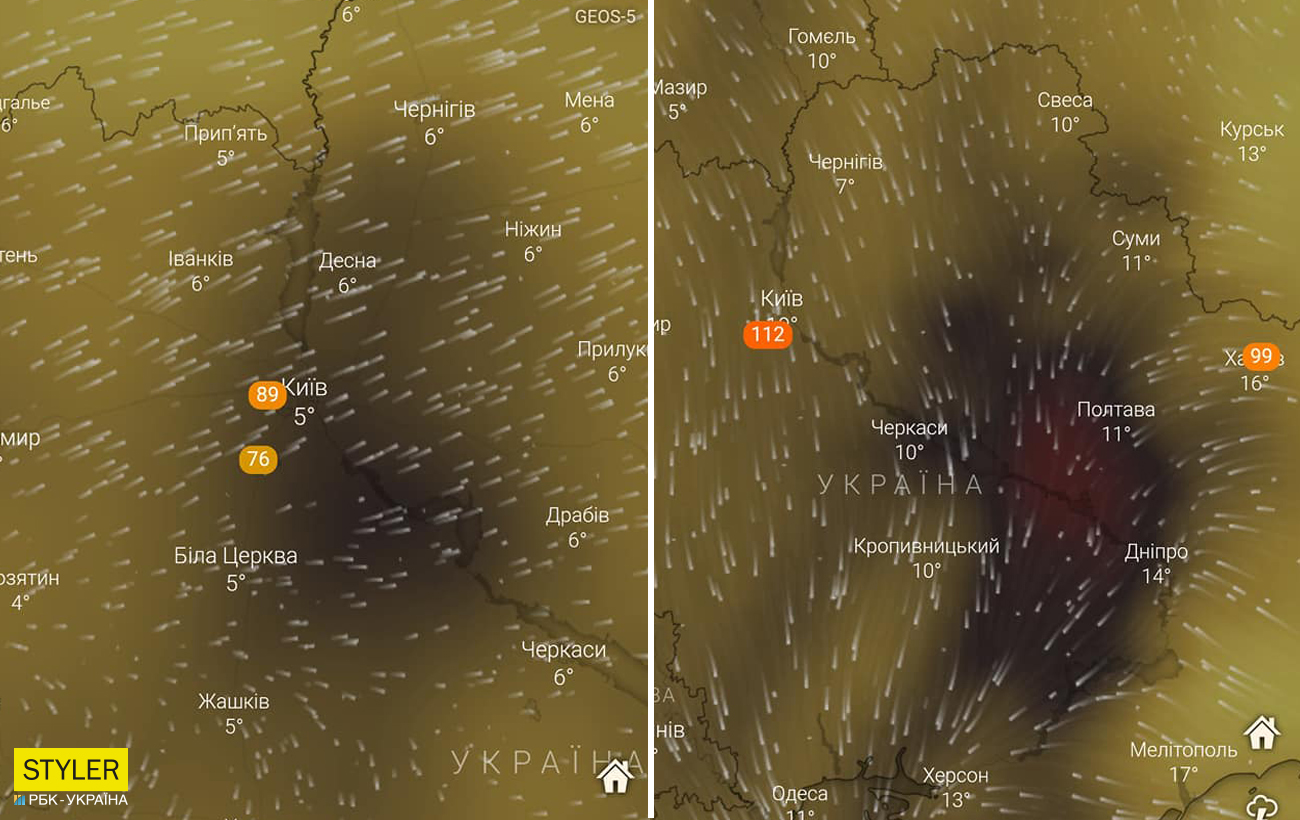 На карті, де зафіксовані дані з різницею в добу, можна помітити, що смог поширюється досить швидко. Зараз він вже досяг Черкас та Полтави. 14-15 жовтня він добереться до столиці.