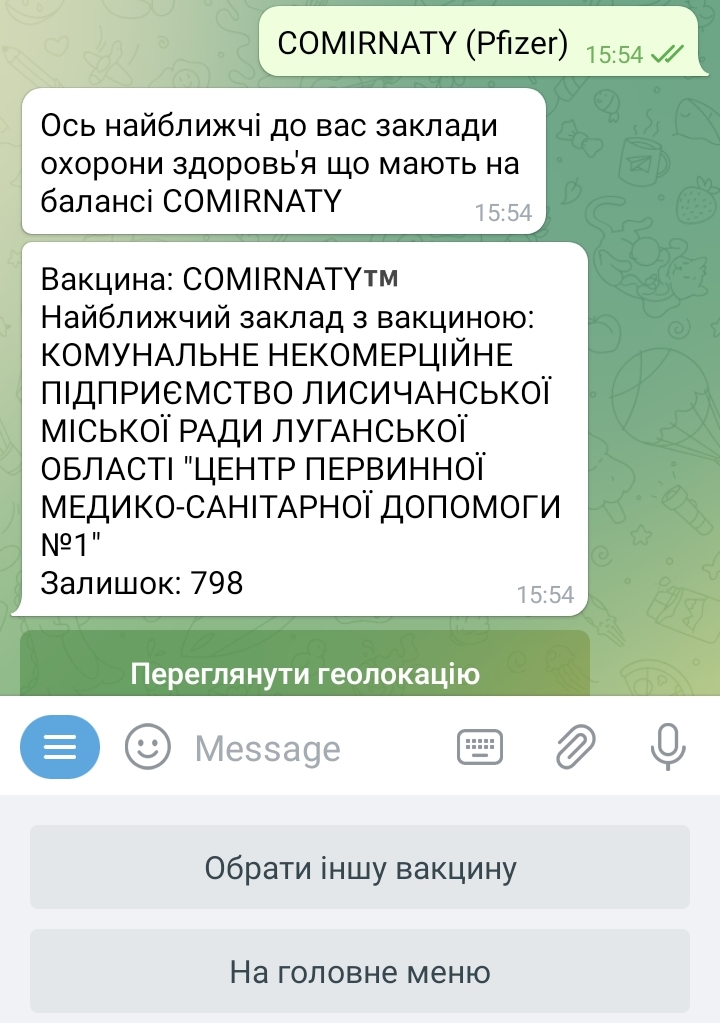 - З телефона - чат-бот "Медичні закупівлі України" у Телеграм. Щоб скористатись цією функцією, необхідно у головному меню бота обрати пункт «Пошук вакцини від COVID-19». По вашій геолокації система знайде найближчі пункти вакцинації. Дізнатися також можна і кількість наявних у цих пунктах вакцин та їх вид.