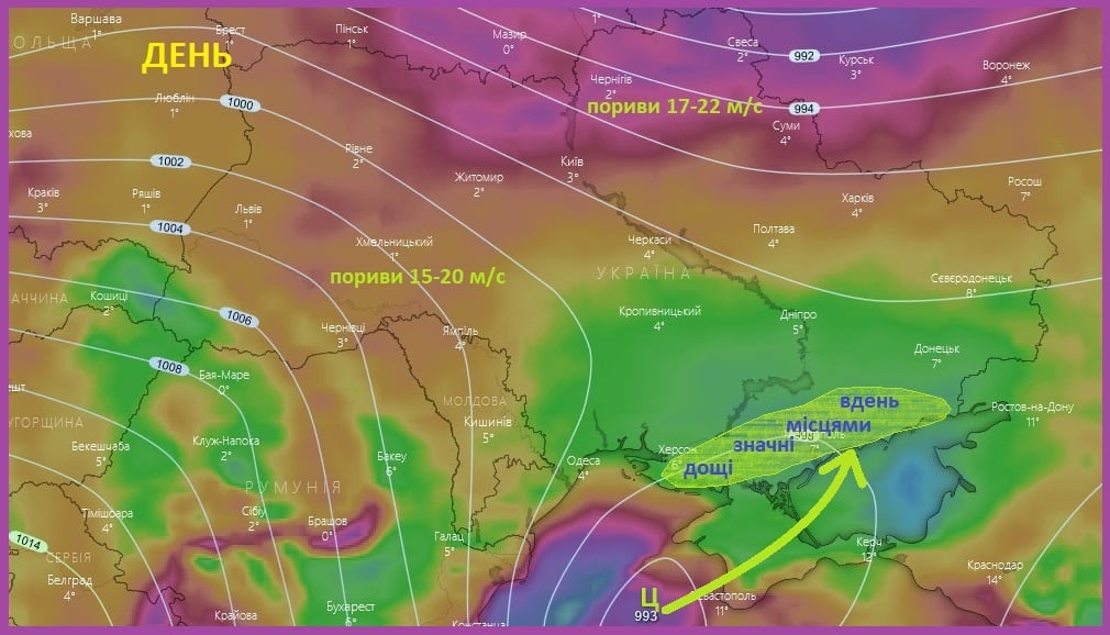 Завтра вдень поривчастим залишиться вітер на західних та північних областях, також 15-20 м/с, а на крайній півночі країни до 22 м/с.