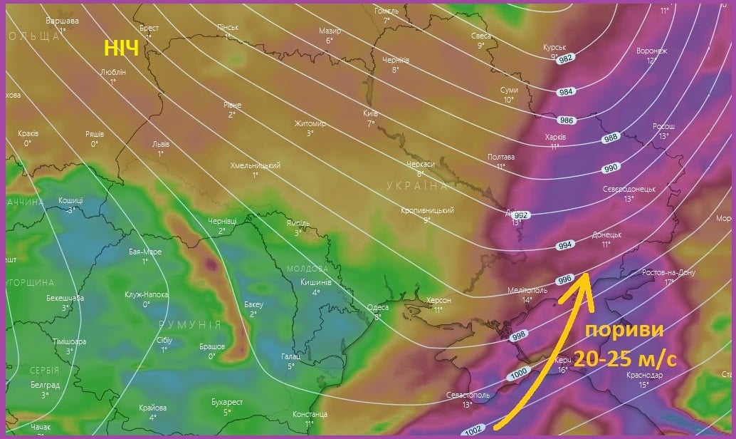 Сьогодні ввечері та найближчої ночі 30 листопада особливо потужними будуть пориви на сході України, особливо у Приазов'ї, де море слугує великим простором для розгону вітру, там очікуються швидкості 20-25 м/с, а в портах аж до 28 м/с.