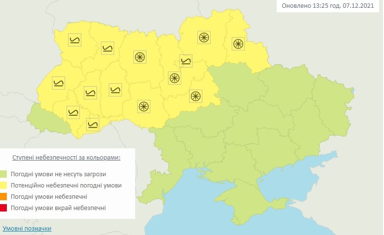 За даними Укргідрометцентру, ввечері 7 грудня, вночі та вдень 8 грудня у північних, Вінницькій, Черкаській областях ожеледь, місцями налипання мокрого снігу; у західних, північних та Вінницькій областях на дорогах ожеледиця. Оголошено І рівень небезпечності - "жовтий".