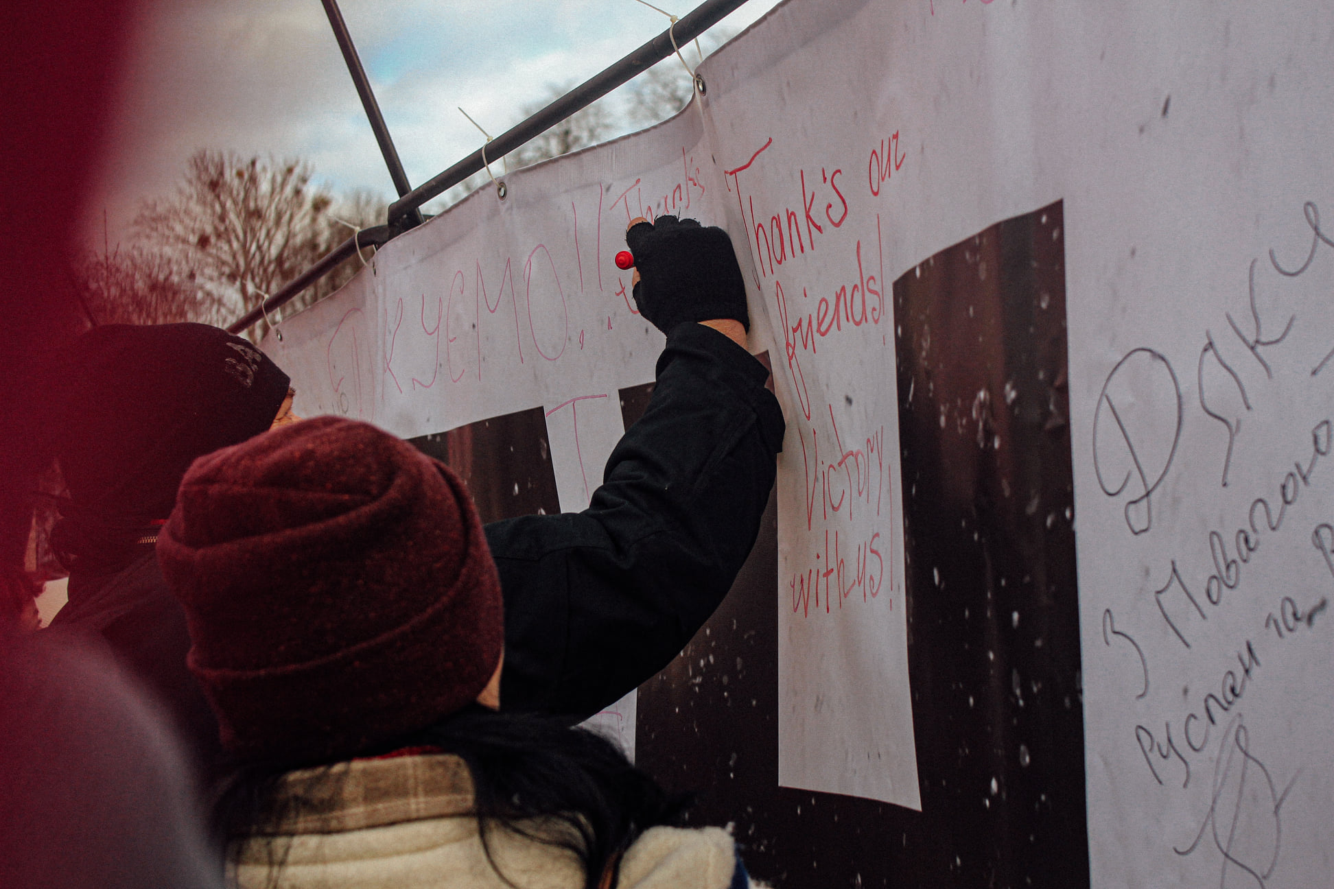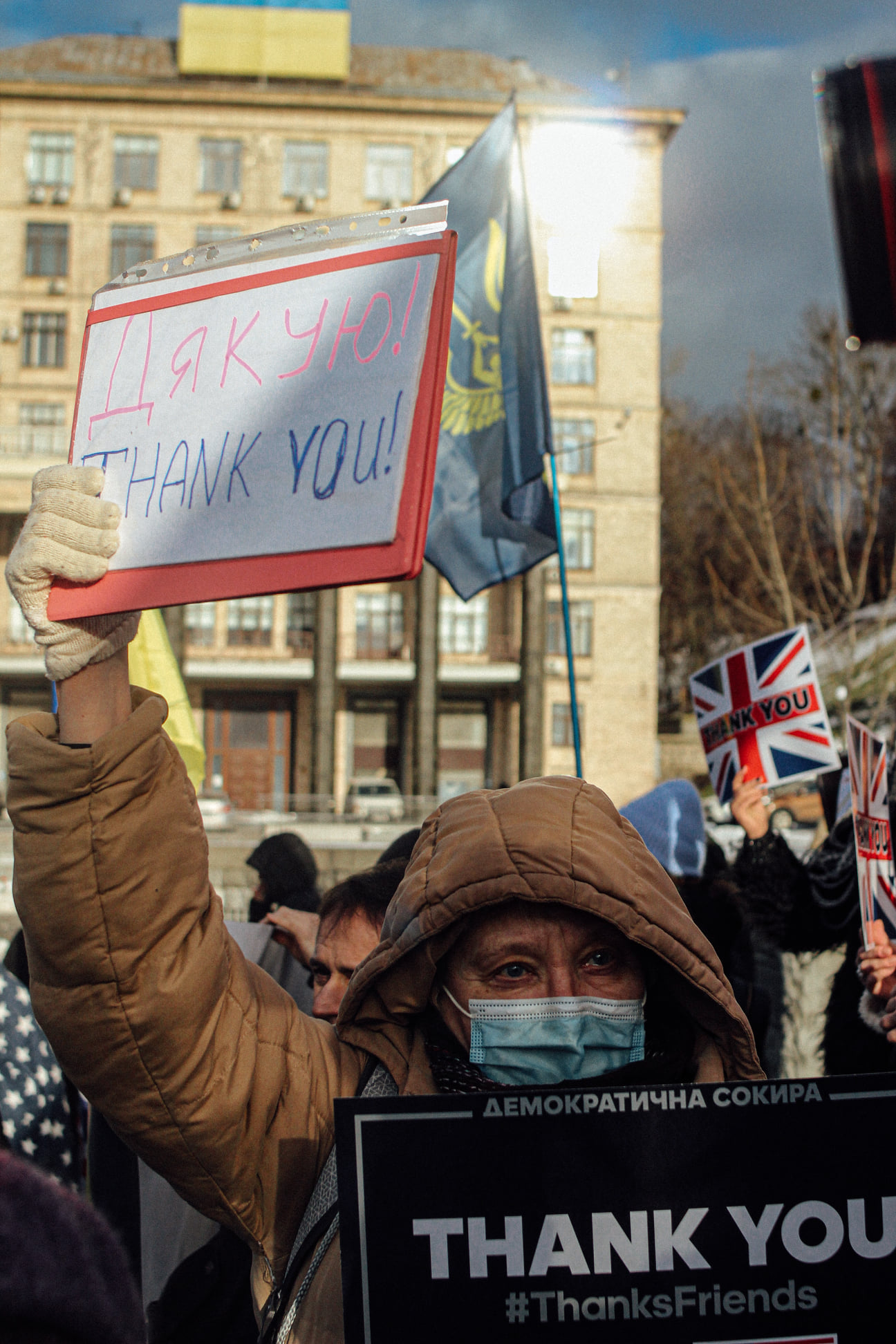 Учасники акції прийшли з прапорами країн, які надають Україні військову та іншу допомогу на фоні загрози російської агресії. Мітингувальники тримали в руках плакати зі словами подяки друзям України різними мовами.