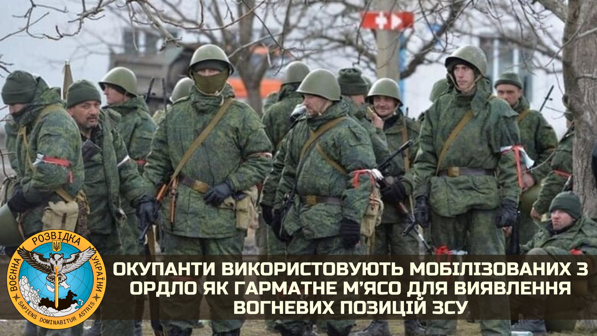 Зі слів самих «мобілізованих», російське командування використовує їх в якості «живця». Тобто, як передовий ешелон розвідки боєм. Підрозділи відправляють на військових автомобілях до лінії зіткнення, ігноруючи високі втрати. І таким чином визначають розташування вогневих позицій ЗСУ", - повідомляють у ГУР Міноборони.
