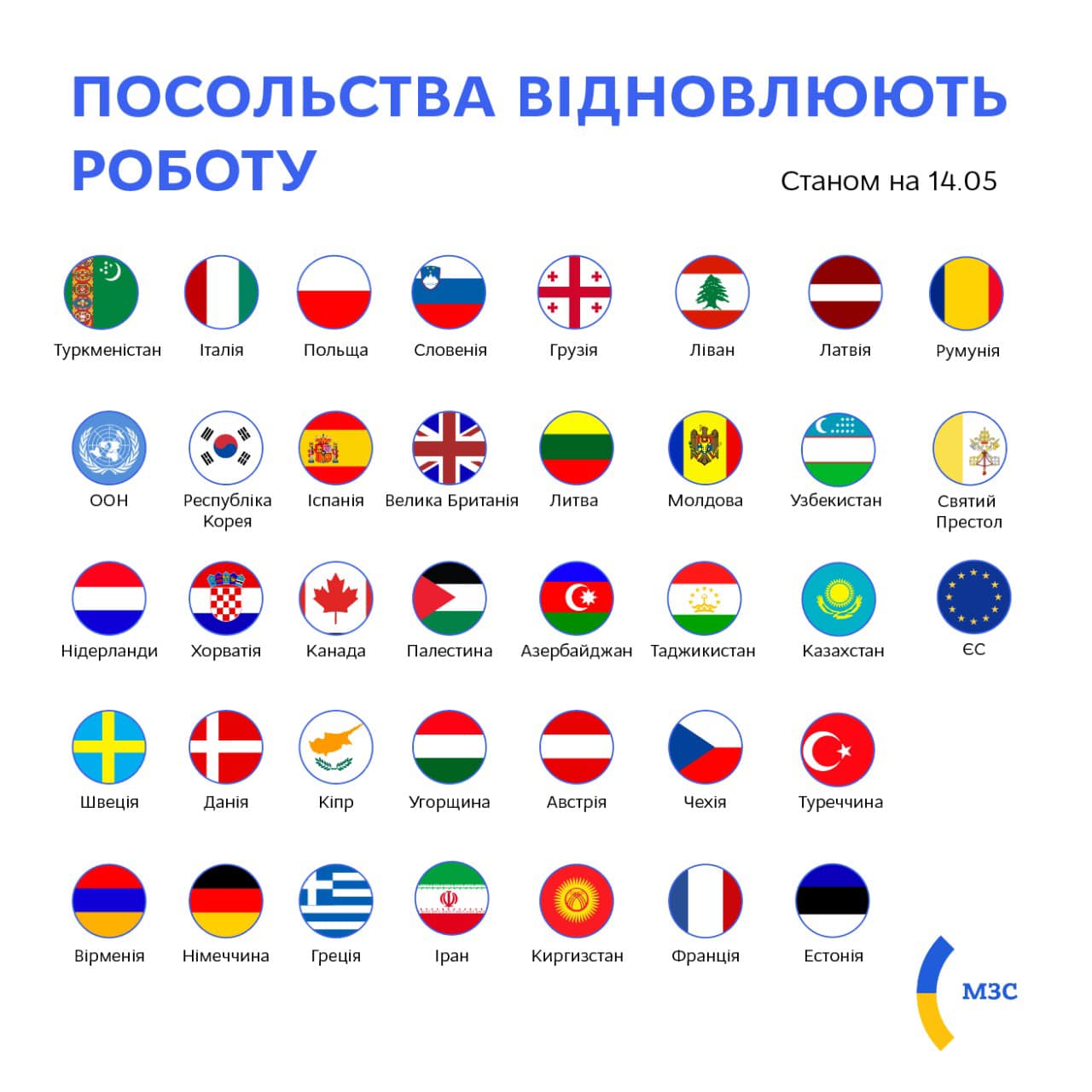 Станом на 14 травня, у столиці України відновили роботу 38 іноземних посольств, що доводить упевненість партнерів у перемозі та перспективах країни.
