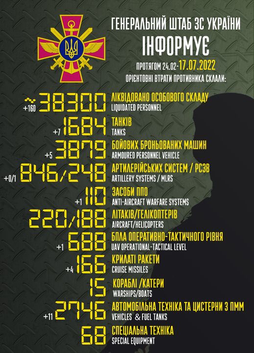Станом на 17 липня загальні бойові втрати серед особового складу армії РФ становили близько 38 300 осіб. Найбільші втрати противник зазнав Бахмутському напрямку.