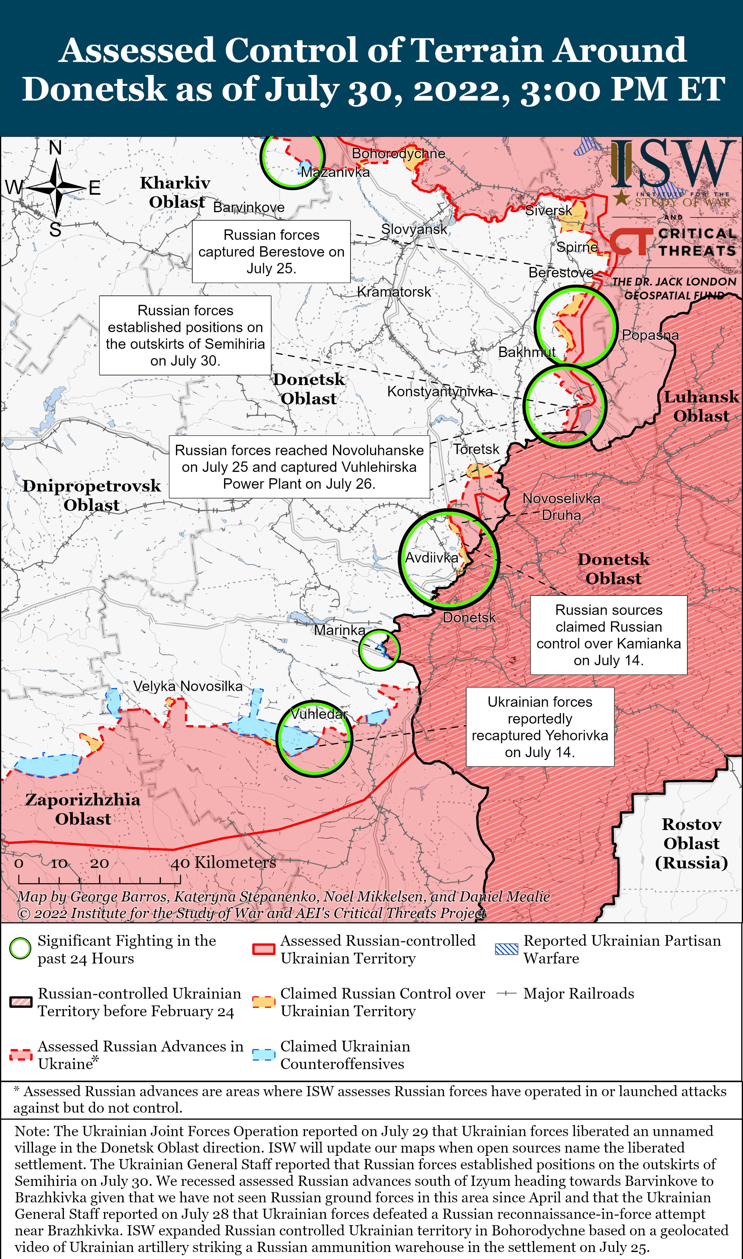 "Зусилля Росії з високою ймовірністю спробують взяти під контроль якомога більшу територію на Донеччині до початку "референдумів", запланованих росіянами на вересень. Для цього вони змушені будуть зосередитися на взятті Бахмута", - йдеться в повідомленні.