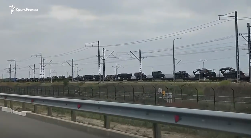 Ешелон з військовою технікою був помічений перед заїздом на Кримський міст з боку РФ, передає Час Пік.