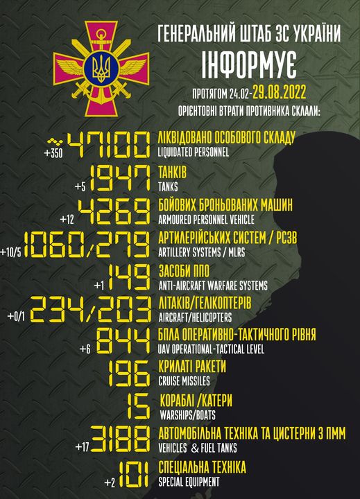 Загальні бойові втрати противника з 24.02 до 29.08 орієнтовно склали: