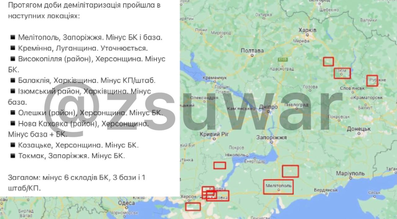 ЗСУ протягом доби демілітаризували 6 складів БК, 3 бази та 1 штаб/командний пункт російських окупаційних військ.