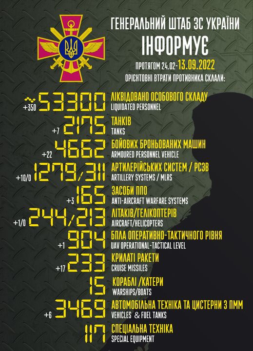 Загальні бойові втрати противника з 24.02 до 13.09 орієнтовно склали: