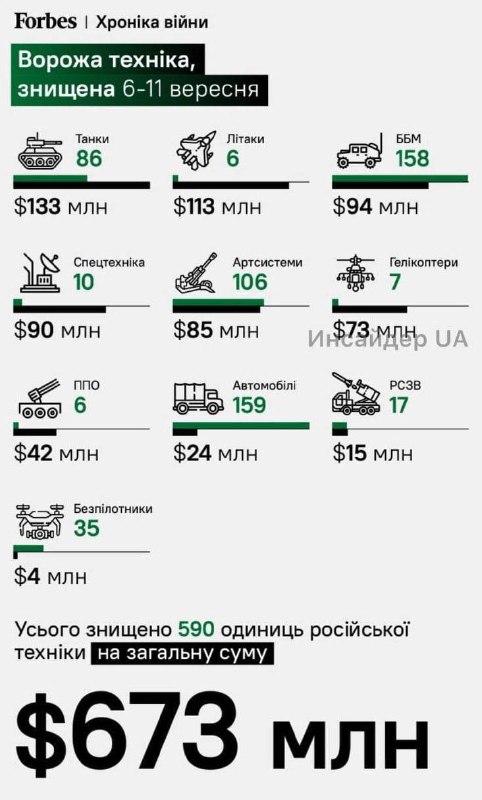 Крім того, з 6 по 11 вересня ЗСУ знищили ще 590 од. російської техніки щонайменше на 673 млн доларів.
