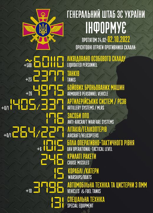 Загальні бойові втрати противника з 24.02 до 02.10 орієнтовно склали: