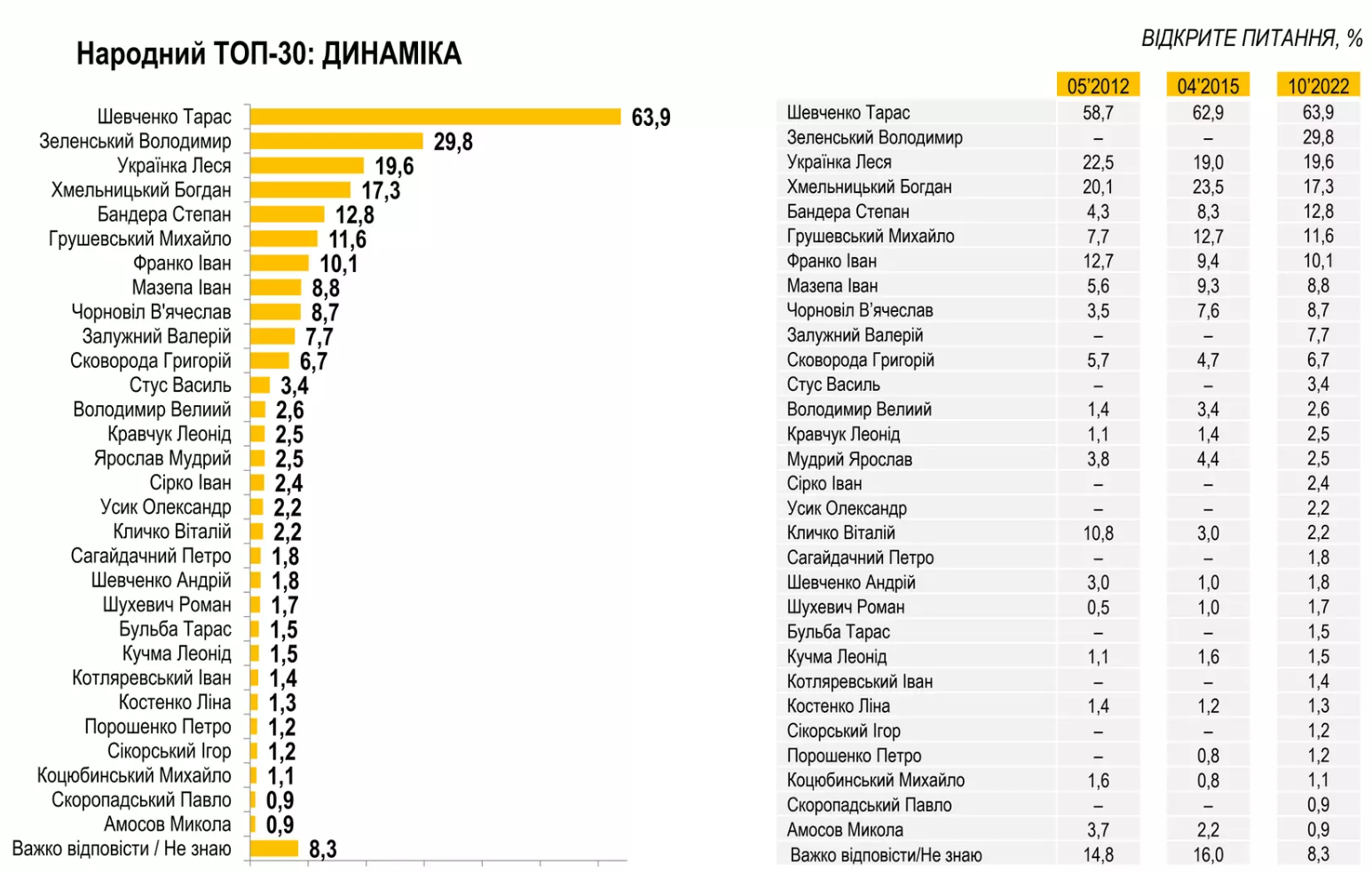 Лідером рейтингу «Народний ТОП» вчергове став Тарас Шевченко (63,9%). До першої п’ятірки найвидатніших українців також увійшли Володимир Зеленський (29,8%), Леся Українка (19,6%), Богдан Хмельницький (17,3%) та Степан Бандера (12,8%). Також в десятці «Народного ТОПу» Михайло Грушевський (11,6%), Iван Франко (10,1%), Iван Мазепа (8,8%), В’ячеслав Чорновіл (8,7%) та Валерій Залужний (7,7%).