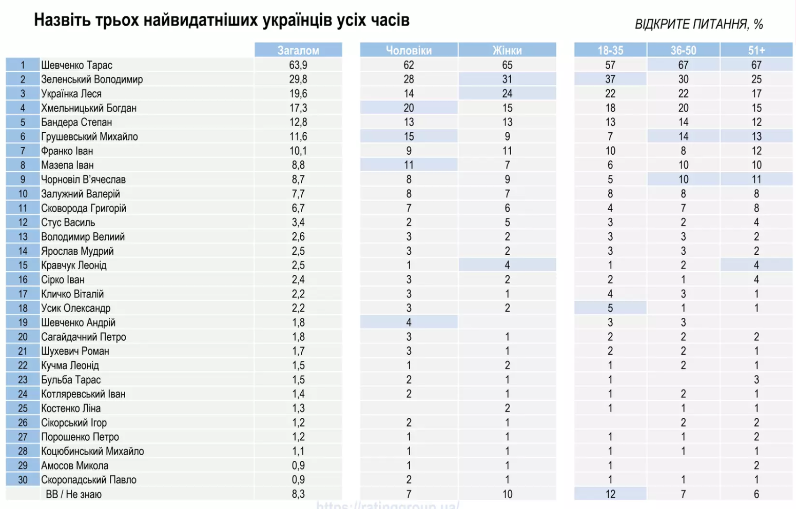 Всього респонденти вказали 148 імен. Разом з тим близько 8% опитаних не змогли назвати (згадати) жодного видатного українця.