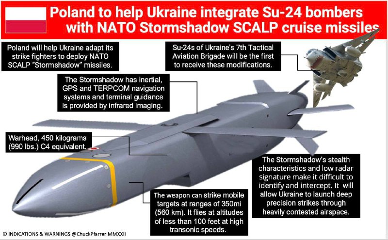 Польща допоможе Україні адаптувати бомбардувальники Су-24 для перенесення ракет НАТО "Storm Shadow". Крилата ракета летить на малій висоті, повторюючи ландшафт поверхні землі й не помітна для радарів.