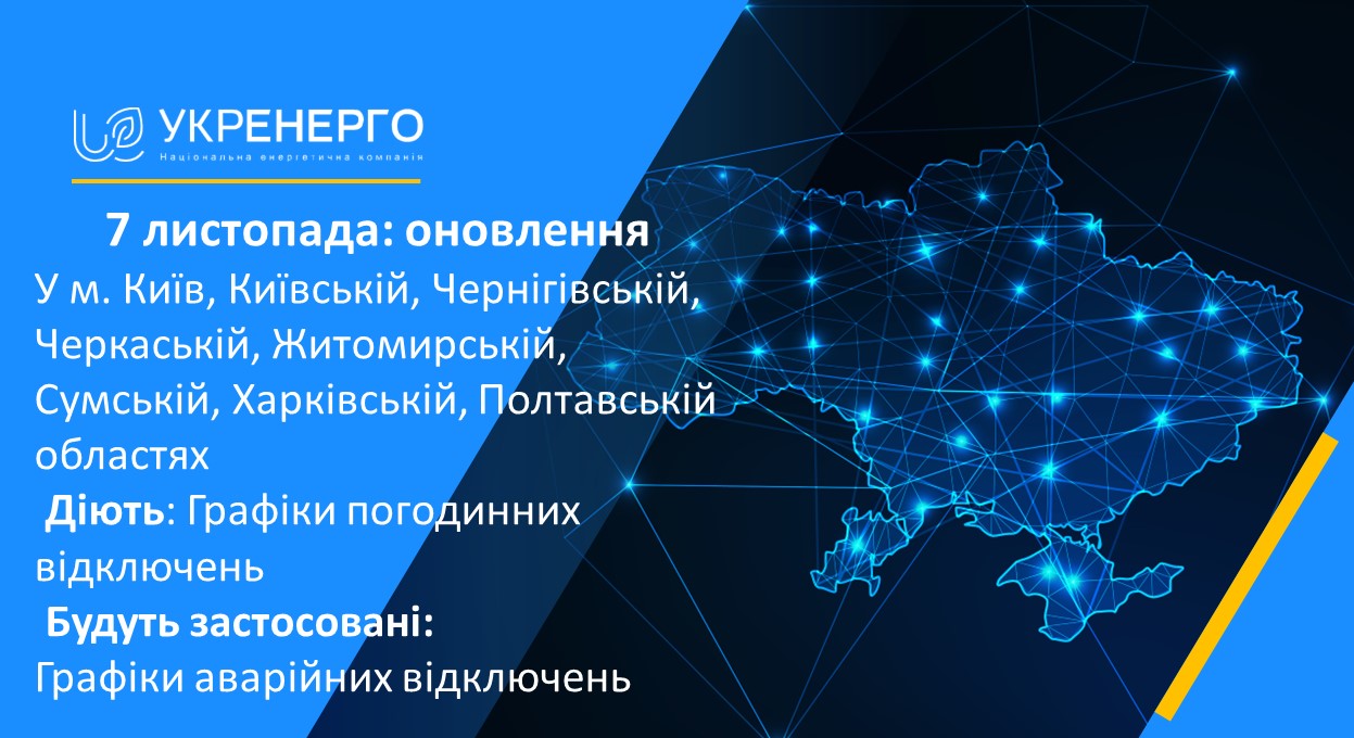 Диспетчерський центр НЕК "Укренерго" прогнозує дефіцит в енергосистемі та надав операторам розподільчих мереж (обленерго) обсяги для обмеження електропостачання на завтра 7 листопада для споживачів у м. Київ, Київській, Чернігівській, Черкаській, Житомирській, Сумській, Харківській, Полтавській областях.