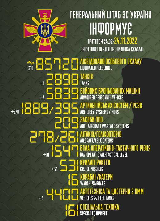 Загальні бойові втрати противника з 24.02 до 24.11 орієнтовно склали: