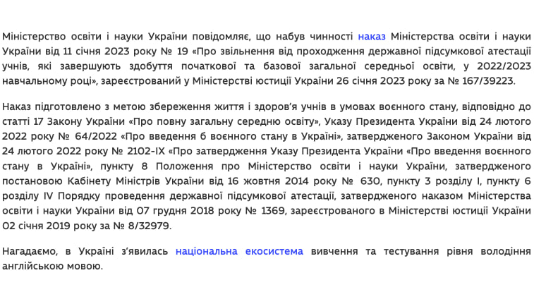 Міністерство освіти й науки України повідомляє, що "набрав чинності наказ від 11 січня 2023 року № 19 "Про звільнення від проходження державної підсумкової атестації учнів, які завершують здобуття початкової та базової загальної середньої освіти, у 2022/2023 навчальному році".