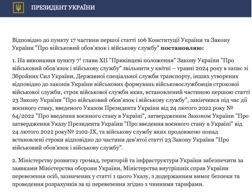 Глава держави постановив звільнити військовослужбовців-строковиків у запас у квітні-травні 2024 року. У законодавстві щодо цього повідомляється, що питання стосується тих військовослужбовців, строк служби яких закінчився під час воєнного стану і був продовжений понад встановлений термін.