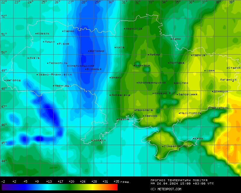 Вихідними, 27 та 28 квітня, за прогнозом Наталки Діденко, в Україні буде і не холодно, і не спекотно. У денні години очікується +18...+23 °C, на сході до +26 °C.