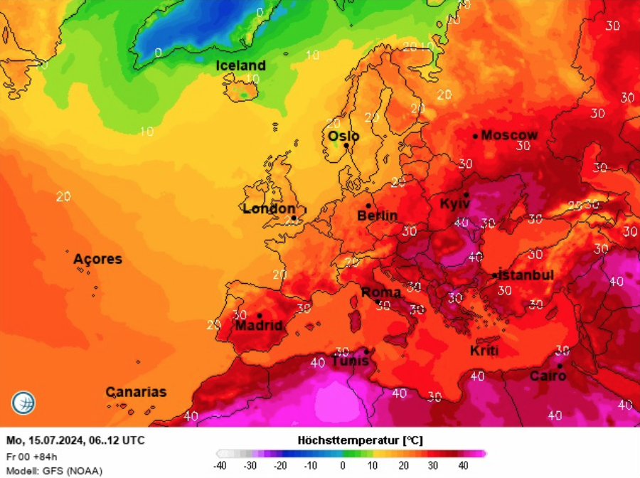 У суботу в Сумській, Харківській областях, на крайньому заході України, а також у Криму очікується +30-34 градуси. На решті території України - сильна спека, протягом дня +35-40 градусів, у південній частині +38-42 градуси.