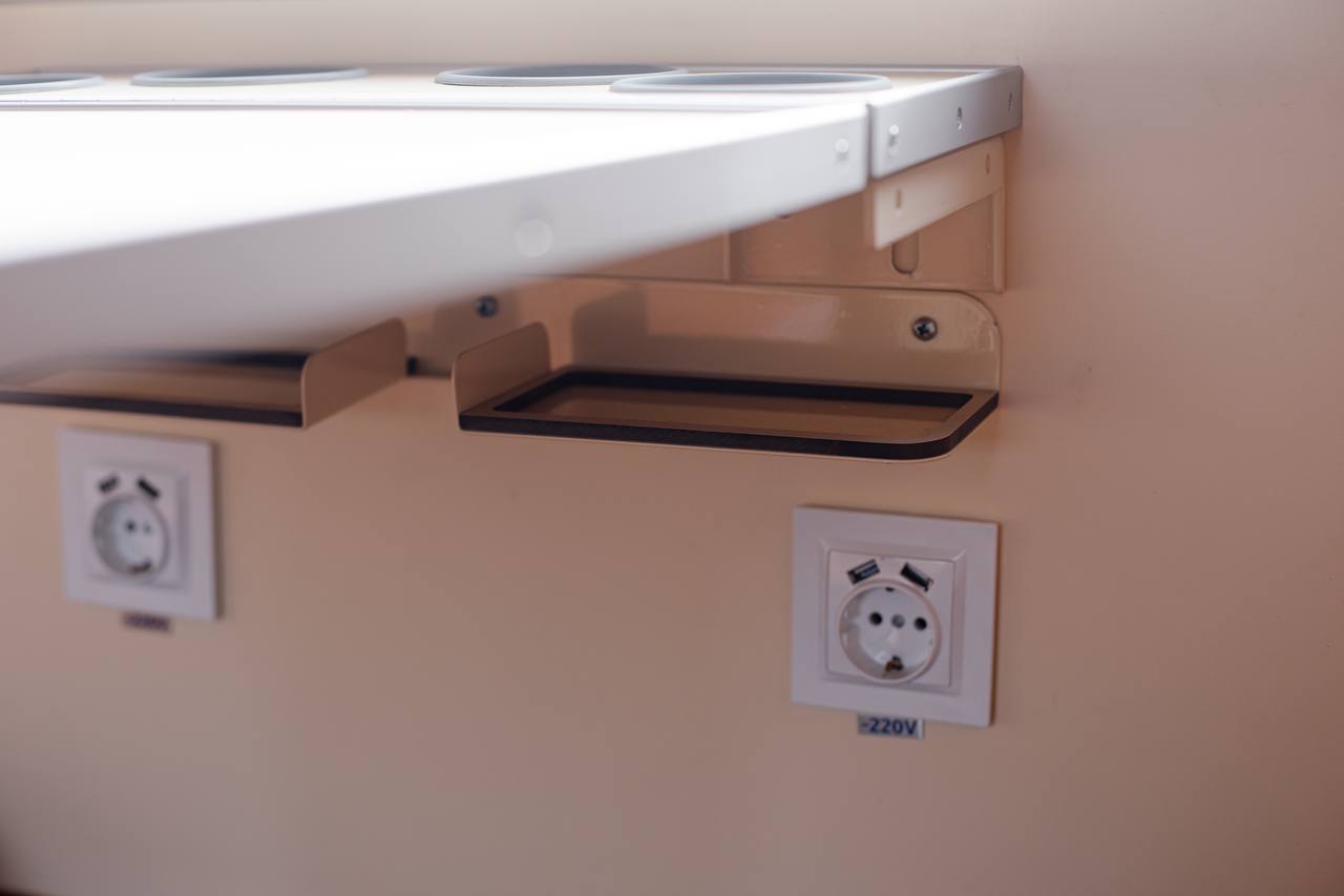 - Розетки та порти для зарядки: біля кожного місця розміщені стандартні розетки, порти USB та Type-C, що дозволить заряджати гаджети під час поїздки.