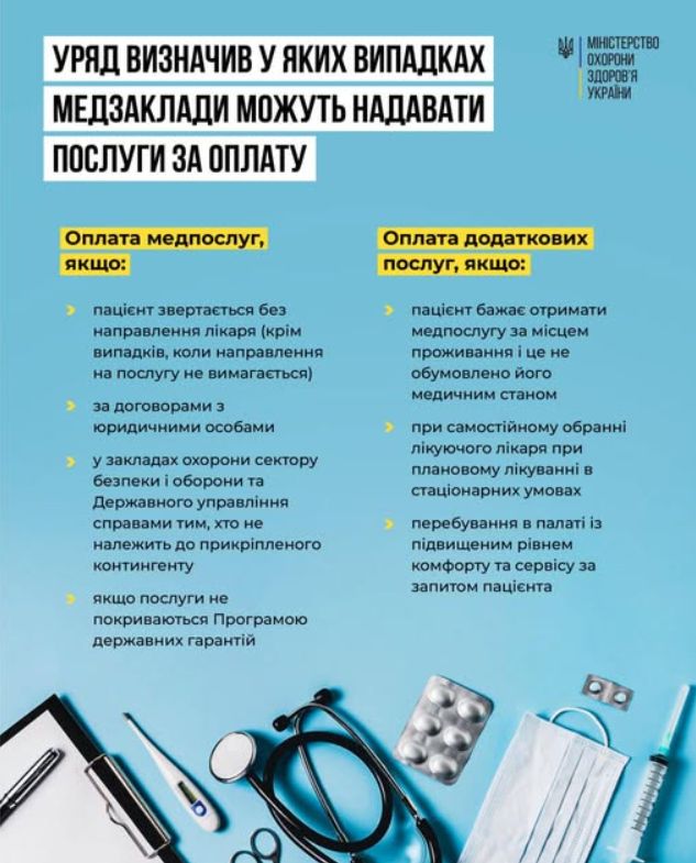 Міністерство охорони здоров'я також уточнило, що платні медичні послуги можуть надаватися у випадках, коли пацієнт звертається без направлення лікаря, якщо це не потрібно за медичними показаннями, або якщо послуга не входить до програми державних гарантій. Також оплачуються послуги за бажанням пацієнта, такі як виклик лікаря додому або вибір лікаря для планової допомоги.