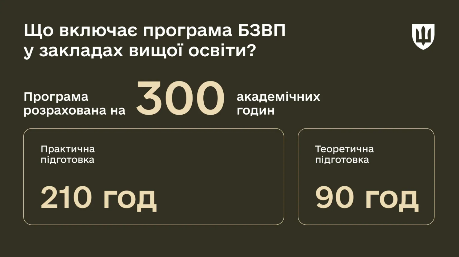Базова загальновійськова підготовка - це програма військової підготовки для студентів. Вона передбачає 300 академічних годин і викладатиметься на другому році навчання для студентів вузів, для решти - на першому році навчання.