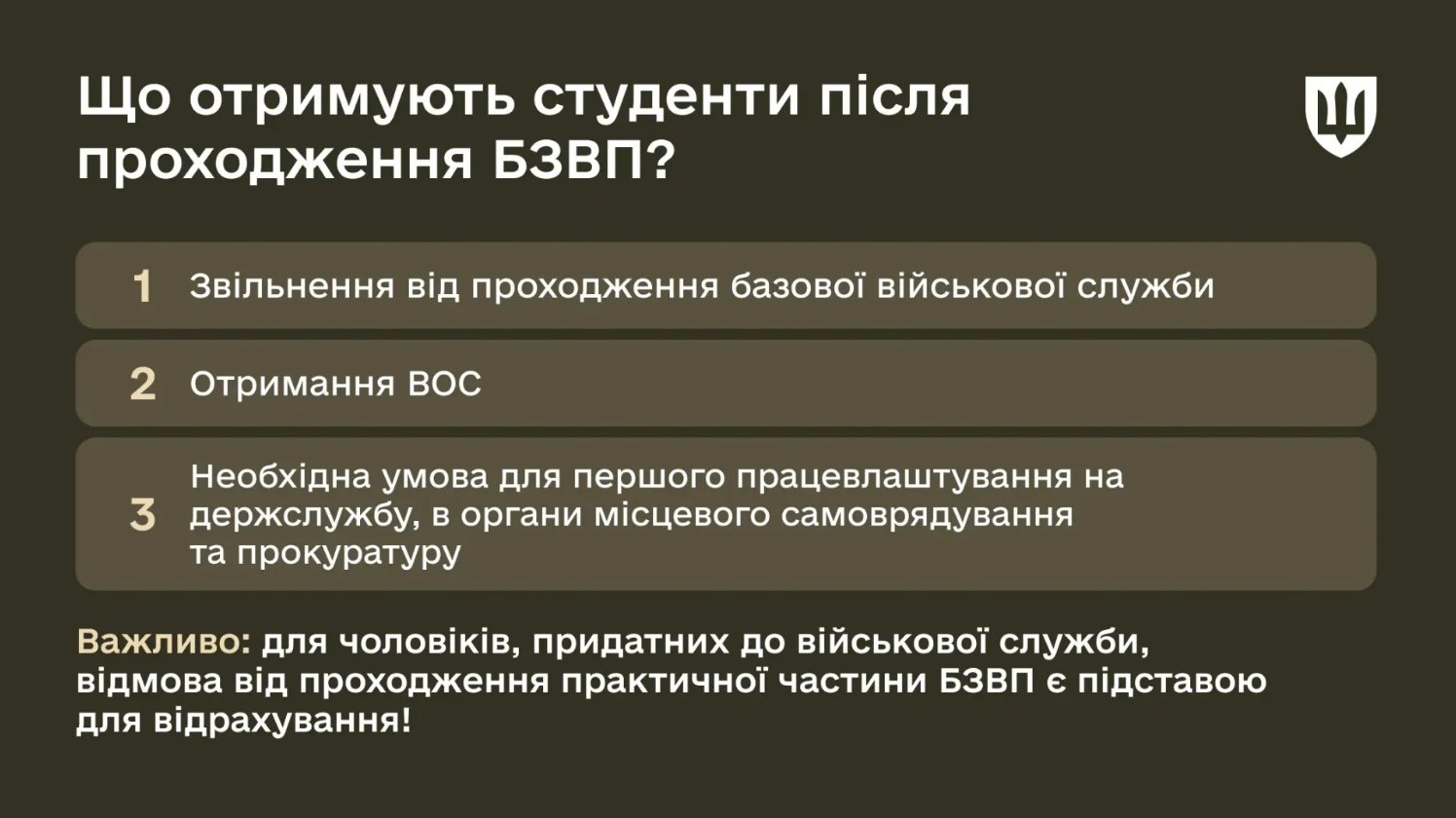 Студенти чоловічої статі, які відмовляться від проходження базової загальновійськової підготовки, можуть бути відраховані. Для чоловіків і теоретичний, і практичний курс БЗВП є обов'язковим.