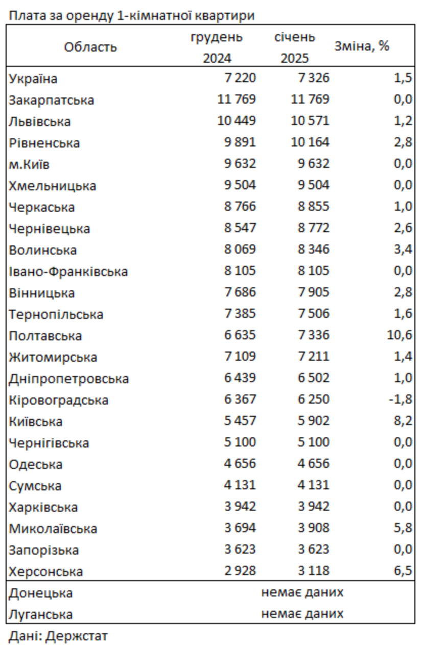 Середня плата за місячну оренду 1-кімнатної квартири у січні 2025 року становила 7 326 гривень. За останній місяць ціни зросли на 1,5%.