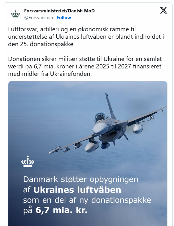 Данія оголосила про новий пакет військової допомоги Україні вартістю 6,7 мільярда данських крон (близько 970 мільйонів доларів). Цей пакет стане 25-м з початку повномасштабної війни та буде спрямований на посилення протиповітряної оборони (ППО), артилерії та підтримку Військово-повітряних сил України.