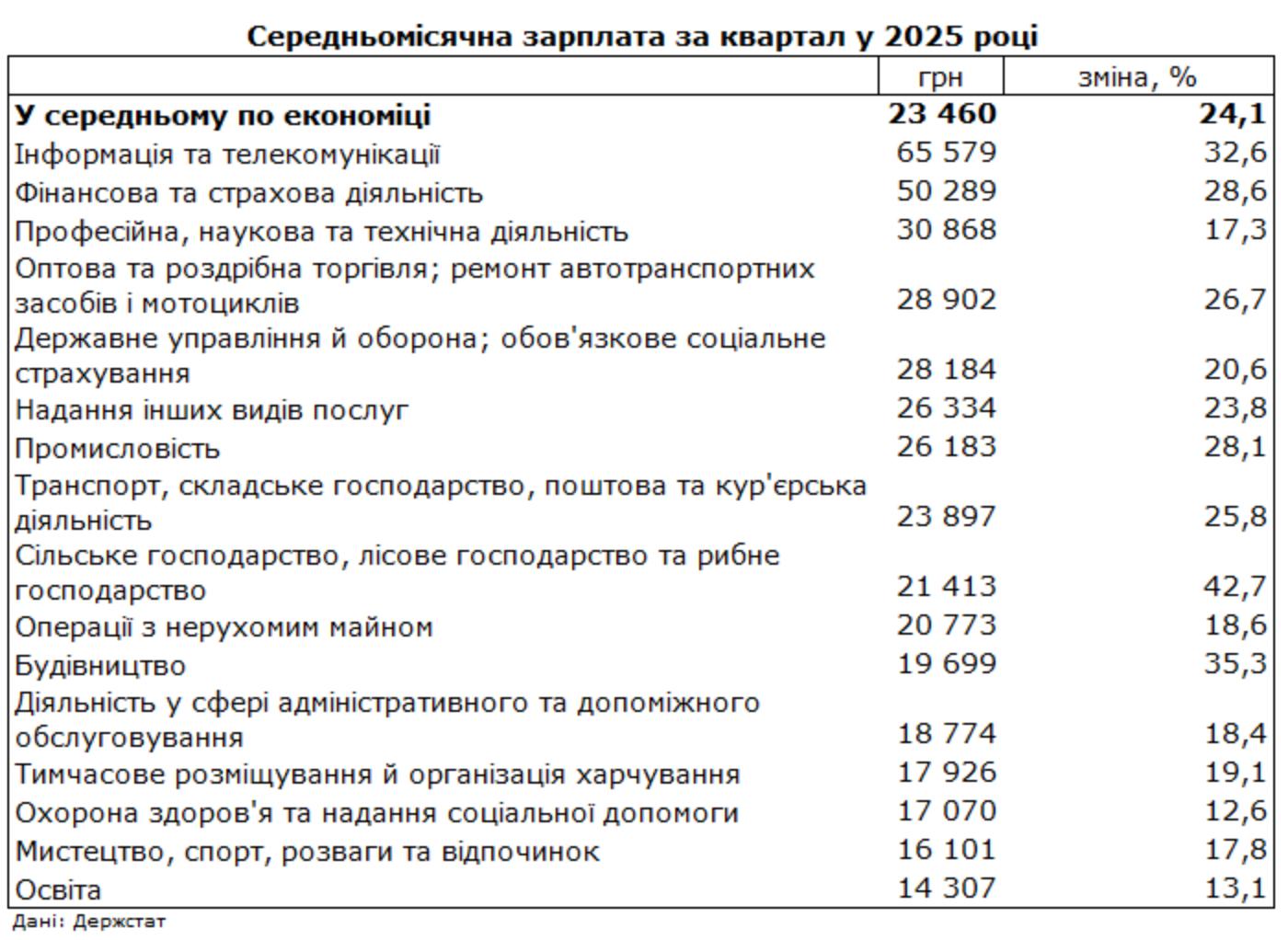 У першому кварталі 2025 року найвища заробітна плата була у сфері "Інформація та телекомунікації", де вона зросла на 32,6% до 65 579 гривень.