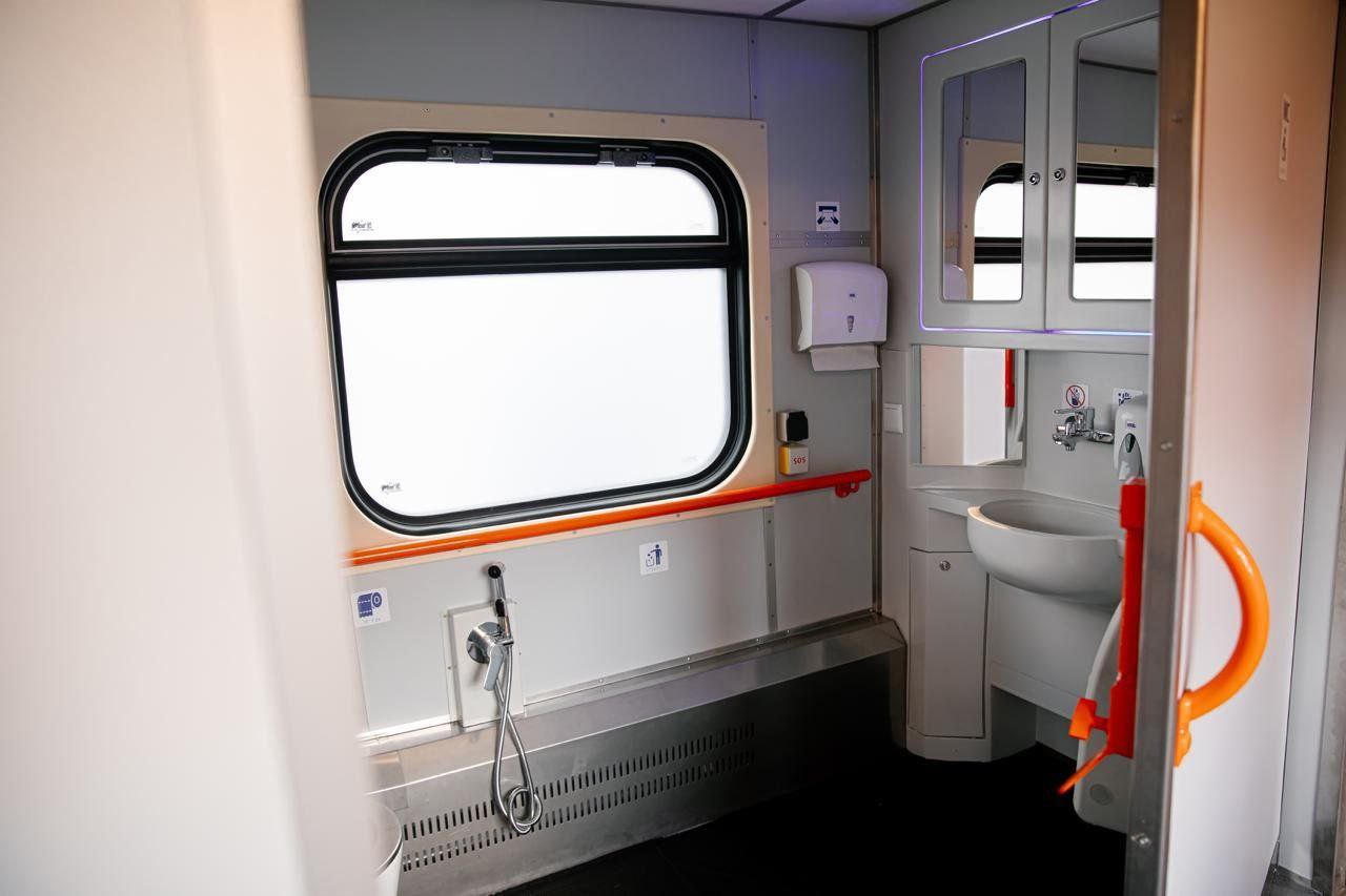 - Вбиральня з душем та SOS-кнопкою: в ній є тримач для милиць, пеленальний столик та дитяче крісло.