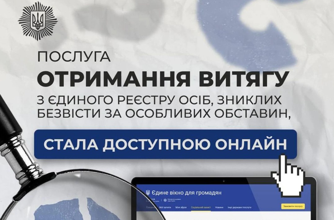 Міністерство внутрішніх справ України запустило онлайн-послугу для отримання витягу з Єдиного реєстру осіб, які зникли безвісти за особливих обставин. Ця послуга доступна 24/7 та дозволяє отримати документ за кілька днів.