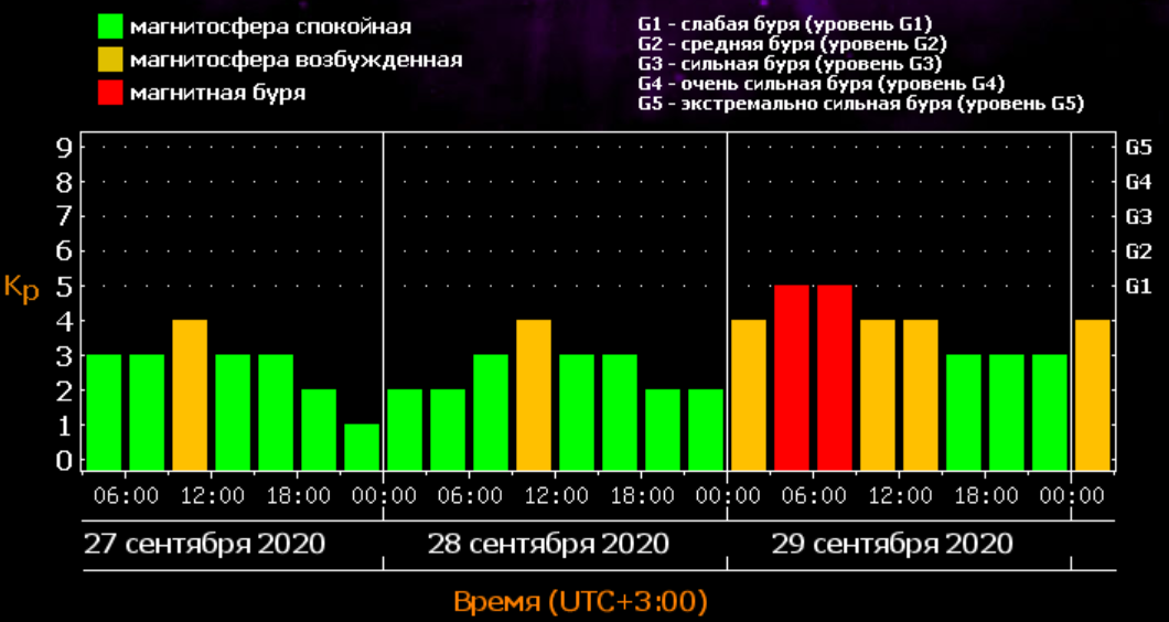 Згідно з опублікованими даними, сьогодні, 27 вересня, магнітосфера вже збуджена. Так буде тривати і завтра, а вранці 29 вересня геомагнітна активність досягне магнітної бурі рівня G1.