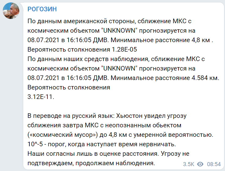 Посилаючись на "дані американської сторони", він заявив, що зближення МКС з космічним об'єктом "UNKNOWN" прогнозується на 08.07.2021 з мінімальним відстанню 4,8 км. Імовірність зіткнення, за даними NASA, 1.28Е-05 (десять в мінус 5-му ступені).