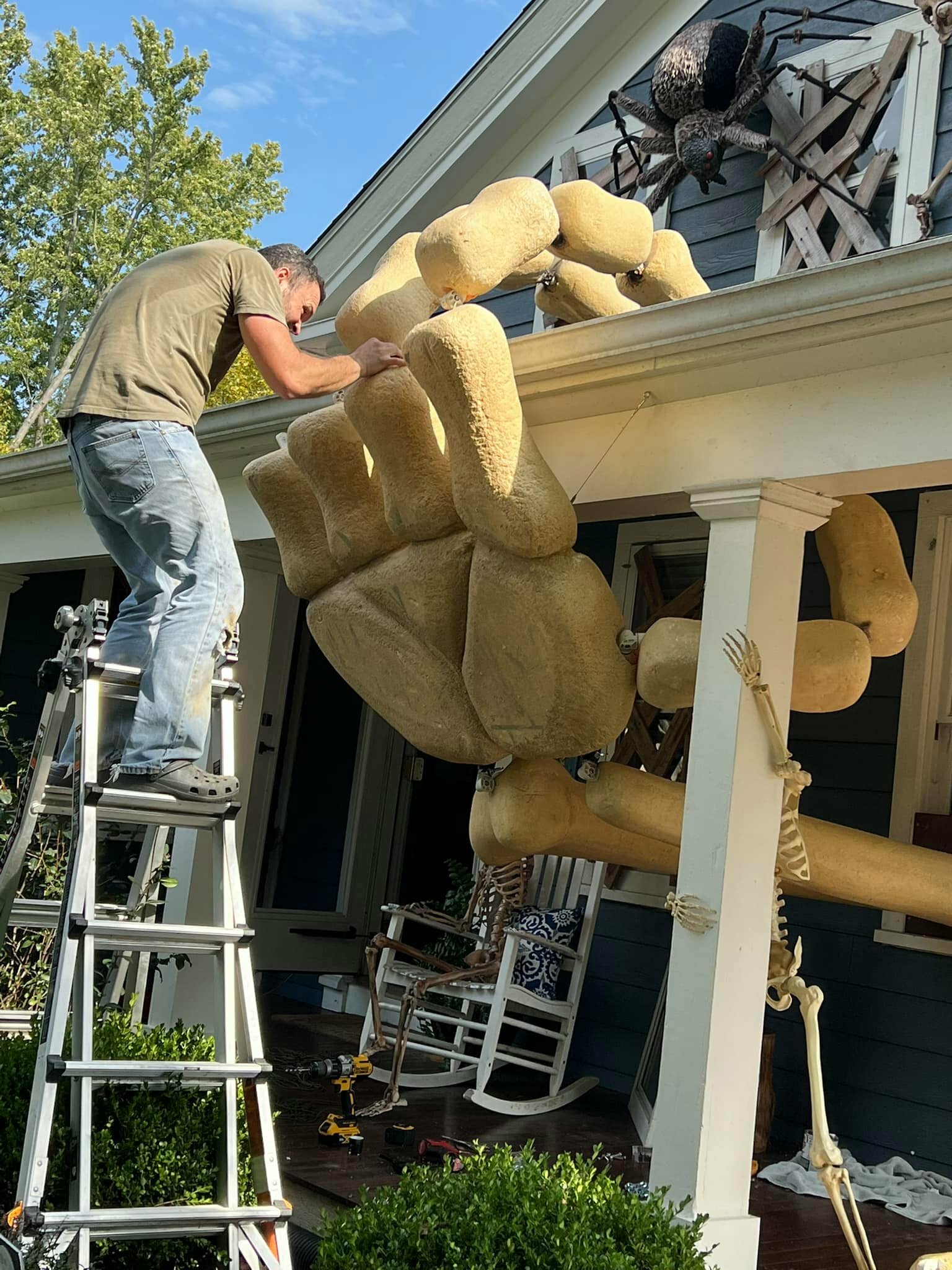 Перкінс конструював скелет упродовж 25 днів, 10 жовтня він встановив руки. Конструкція буде завершена, коли він додасть череп скелета, що пробиває дах будинку.