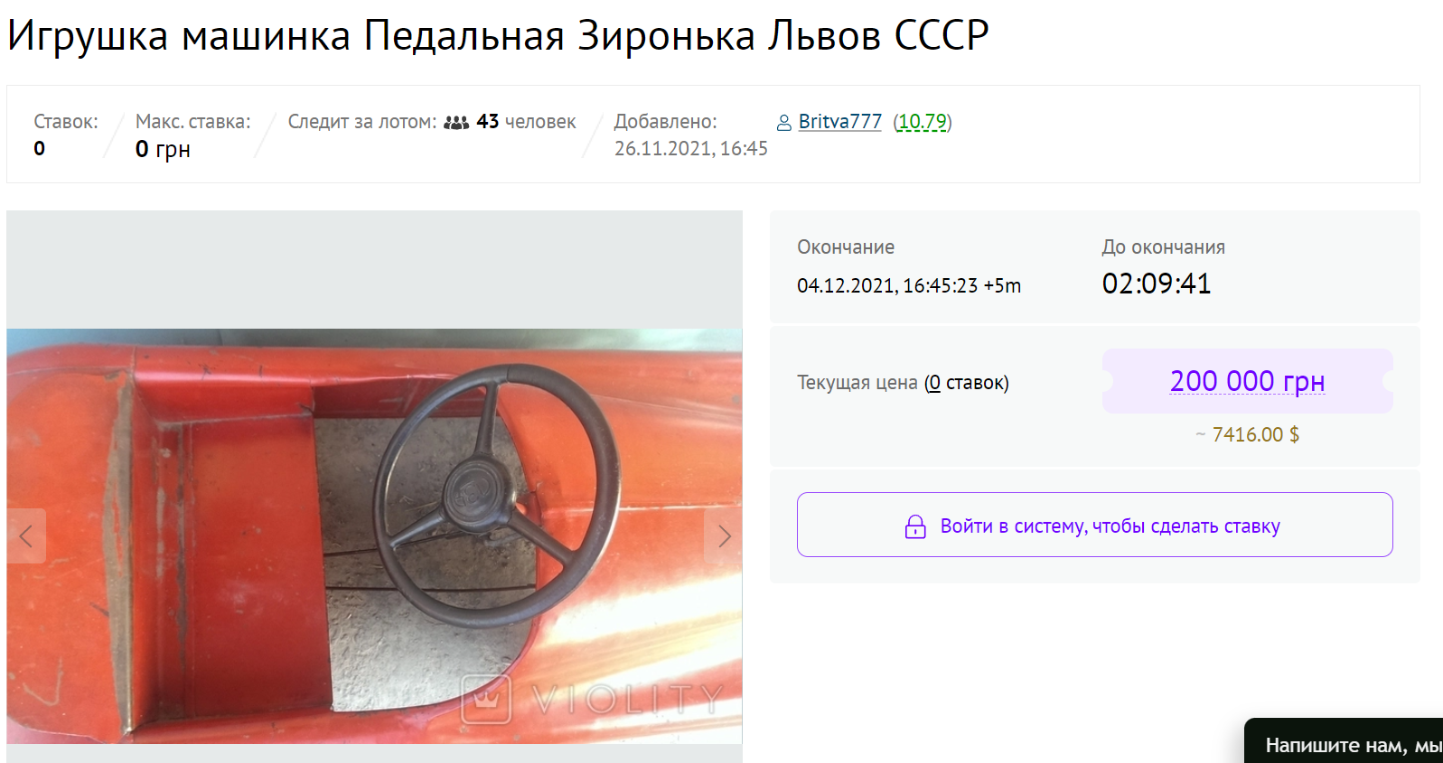 Як, наприклад, така педальна машинка, виготовлена у Львові за часів СРСР. На сайті для колекціонерів violity.com знайшли оголошення, де за таку машинку просять цілих 200 000 грн! За таку суму можна придбати справжній автомобіль.