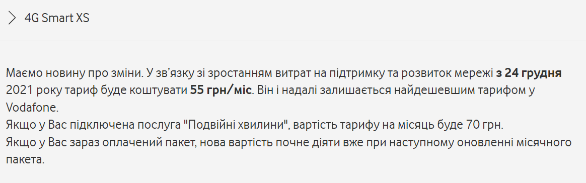 Абонентів попереджають, що з 24 грудня тариф Vodafone 4G Smart XS коштуватиме 55 грн на місяць. До цього щомісячна плата у межах цього тарифу становила 45 грн. на місяць, тобто подорожчання – близько 20%.