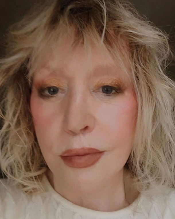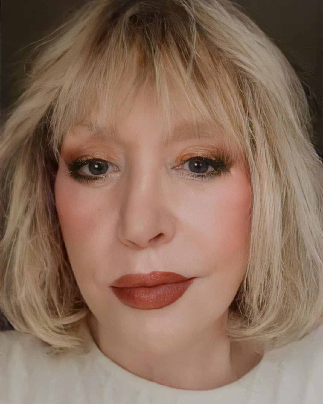 На фото Примадонна зображена з не дуже акуратним макіяжем, без брів, на шкірі видно зморшки, а замість ідеальної укладки - рідкі розпатлані локони.