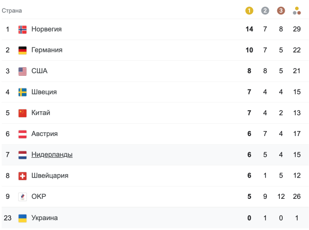 Медальний залік за підсумками 17 лютого
